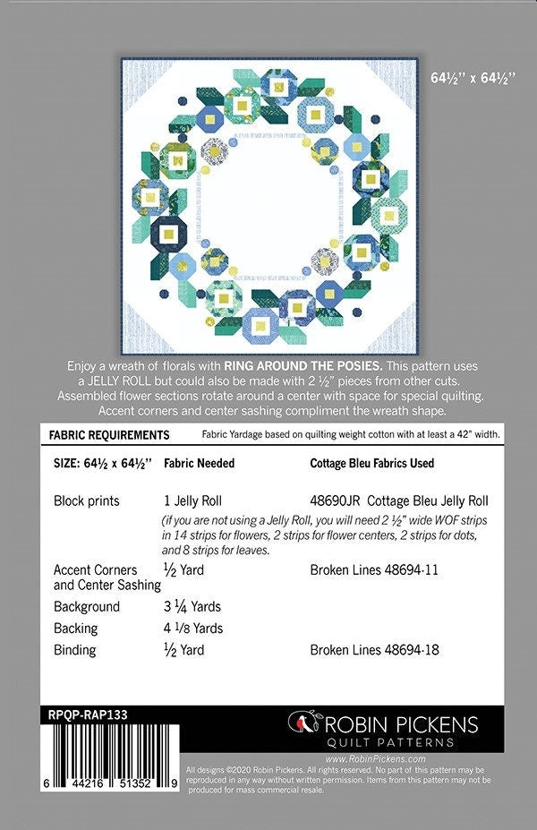 This quilt pattern by Robin Pickens includes the complete instructions to make the Ring Around the Posies quilt featuring the Cottage Bleu fabric collection.