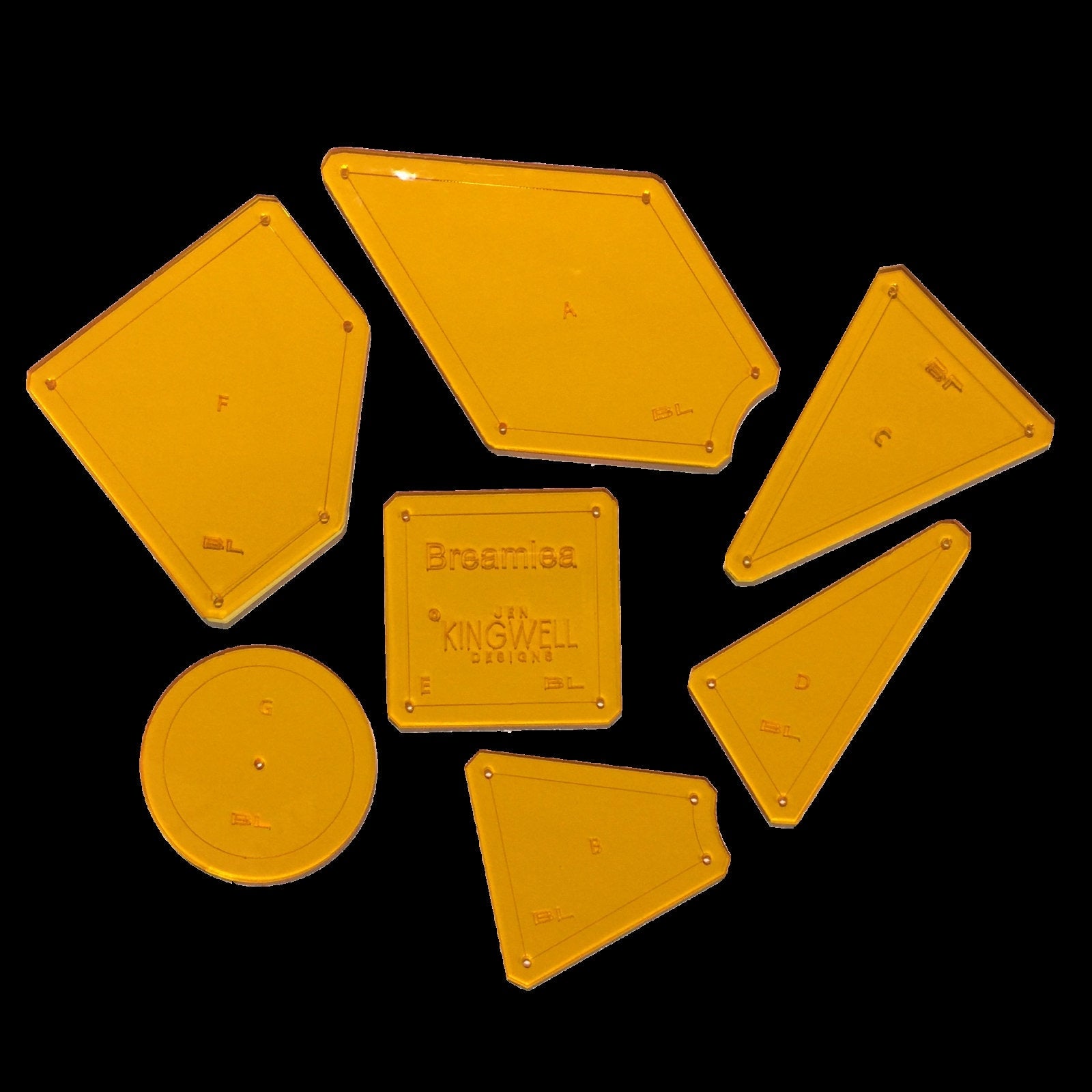 The package contains the (7) acrylic templates to make the Breamlea quilt block by Jen Kingwell.